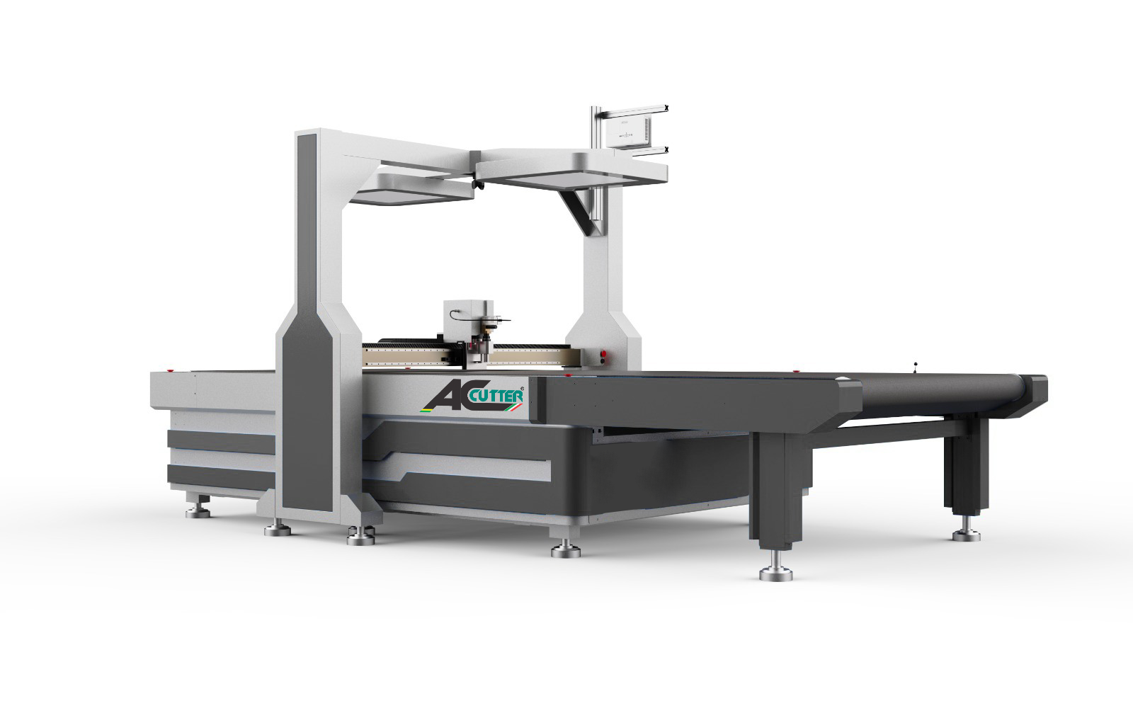 Máquina de corte por faca oscilante vibratória, com campo de 1600x2500mm e mesa móvel (esteira) com câmera superior de ampla visão para corte de materiais sublimados e mapeamento via software incluso.
